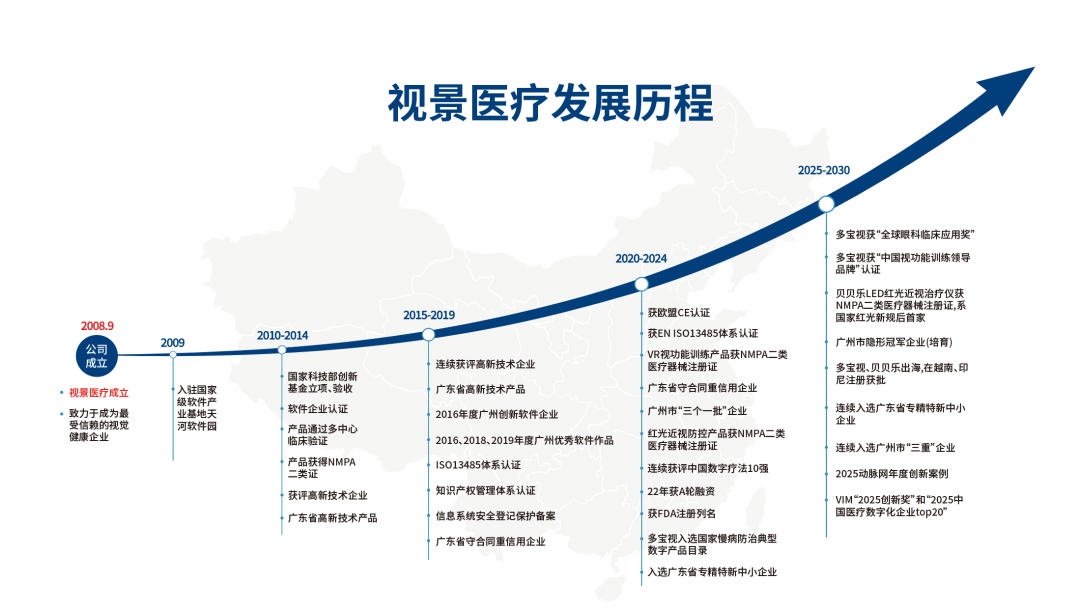 为了推动行业发展,视景医疗牵头或参与制定多项团队标准和行业标准,如《VR视觉训练系统技术和应用规范》等。视景医疗与沙利文和梅斯医学联合发布《中国儿童斜弱视数字治疗现状蓝皮书》和《中国儿童斜弱视数字治疗现状白皮书》等重要产业研究报告,推动视觉健康行业稳健发展。先后荣登“广东省专精特新企业”榜单、入选“2022德勤中国明日之星”榜单、连获“中国数字疗法10强”、“2025全球眼科临床应用奖”、“中国视功能训练领导品牌”等荣誉认可。